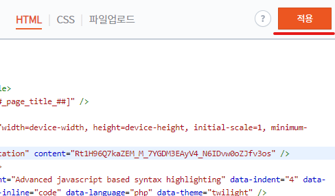 위 그림에 빨간색 네모 상자로 표시한 부분의 HTML <meta ... ... ... /> 태그를 복사합니다.