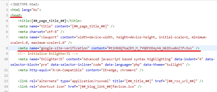 다른 태그(<></> 형태)와 겹치지 않는 적당한 위치에 좀 전에 복사해온 소유권 확인 <meta> 태그를 붙여넣어줍니다.