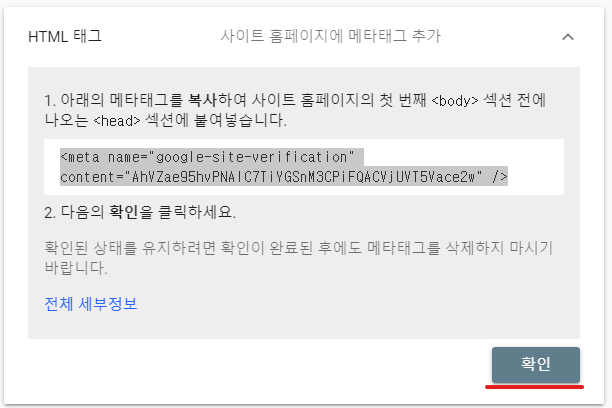 그러면 다시 홈페이지에 소유권을 확인하는 화면이 나옵니다.