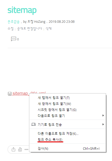방금 등록한 사이트맵 게시물 페이지에서 첨부파일 링크를 '우클릭' 팝업 메뉴에서 '링크 주소 복사' 를 클릭해서